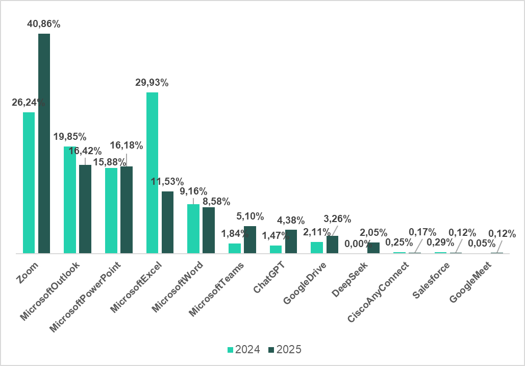 Kaspersky analysts explored how frequently malicious and unwanted software are disguised as legitimate applications commonly used by SMBs, using a sample of 12 online productivity apps. In total, Kaspersky observed more than 4,000 unique malicious and unwanted files disguised as popular apps in 2025. With the growing popularity of AI services, cybercriminals are increasingly disguising malware as AI tools. The number of cyberthreats mimicking ChatGPT increased by 115% in the first four months of 2025 compared to the same period last year, reaching 177 unique malicious and unwanted files. Another popular AI tool, DeepSeek, accounted for 83 files. This large language model launched in 2025 immediately appeared on the list of impersonated tools.